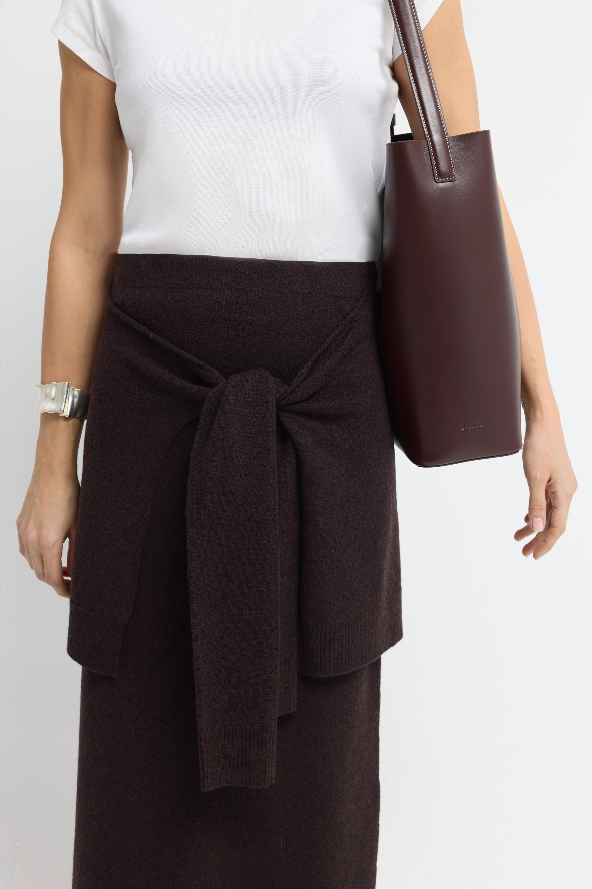 ─ SAYÉS logosu bulunan, çıkarılabilir fermuarlı bordo deri iç çanta ile birlikte sunulur.