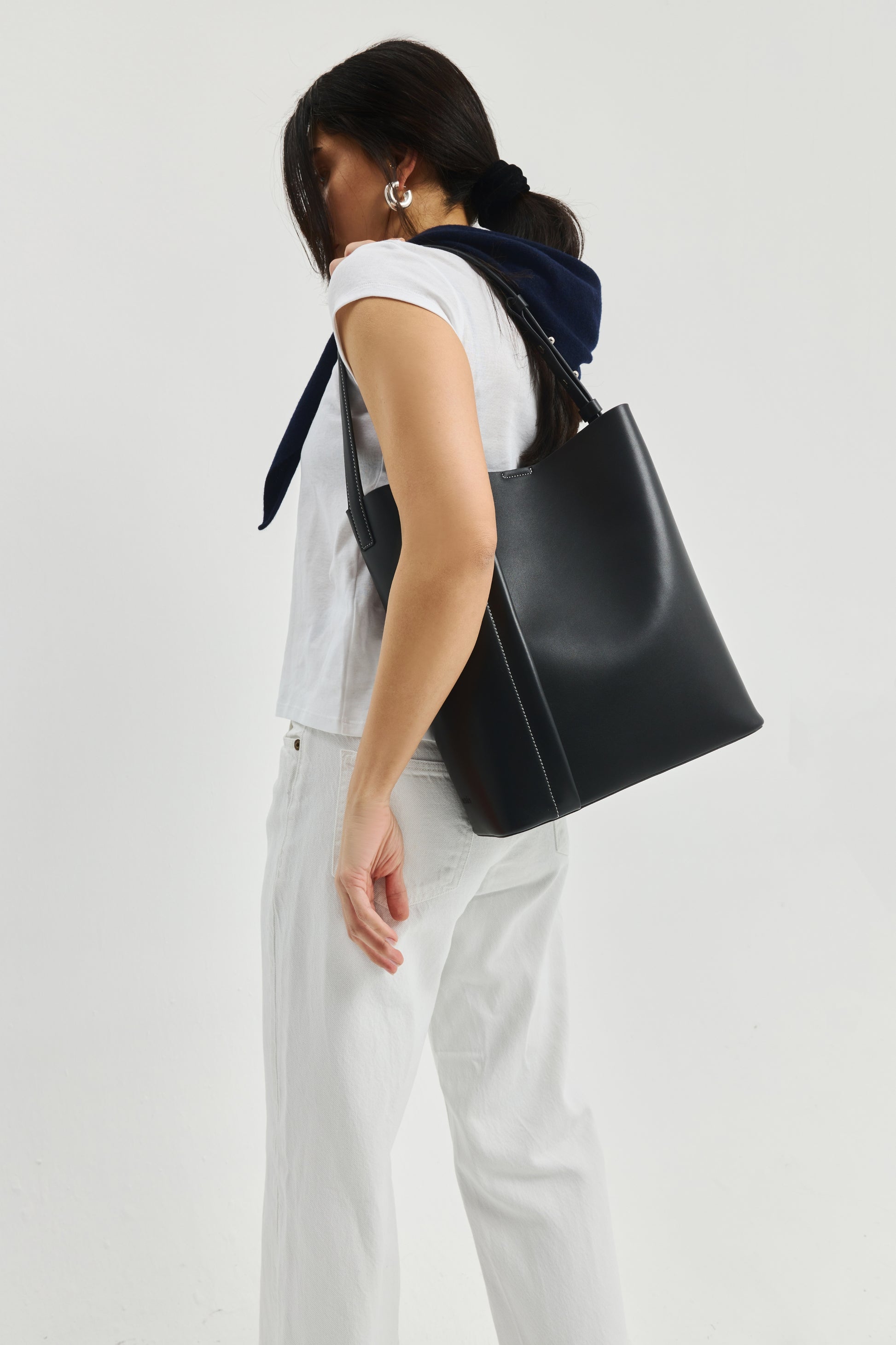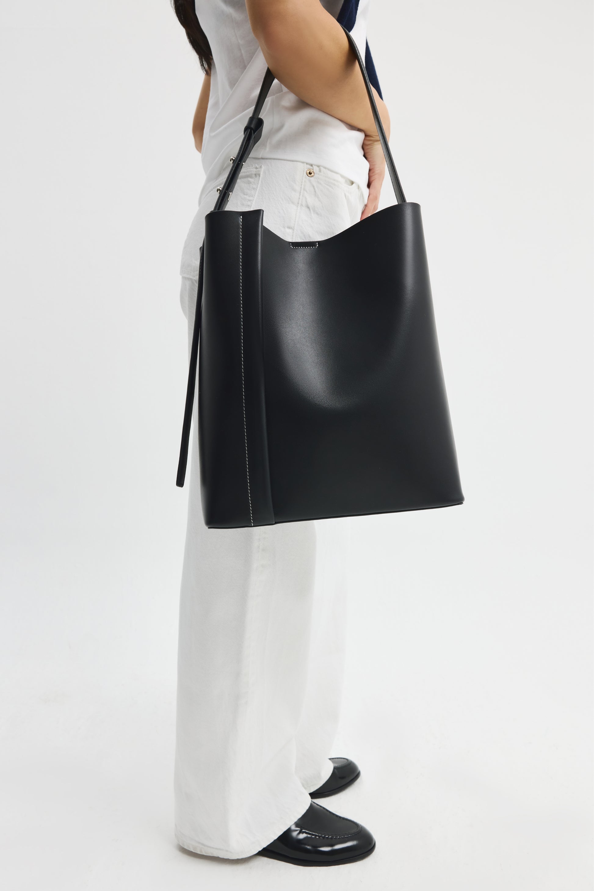 Hafif parlak bitişli siyah dana derisi üzerindeki belirgin kırık beyaz dikişlerle kontrast bir estetik sunan The Tote Plissé, geniş iç hacmi ve ayarlanabilir omuz askısıyla günlük eşyalarınızı ve 13-inch Macbook'u rahatça taşımanızı sağlar.