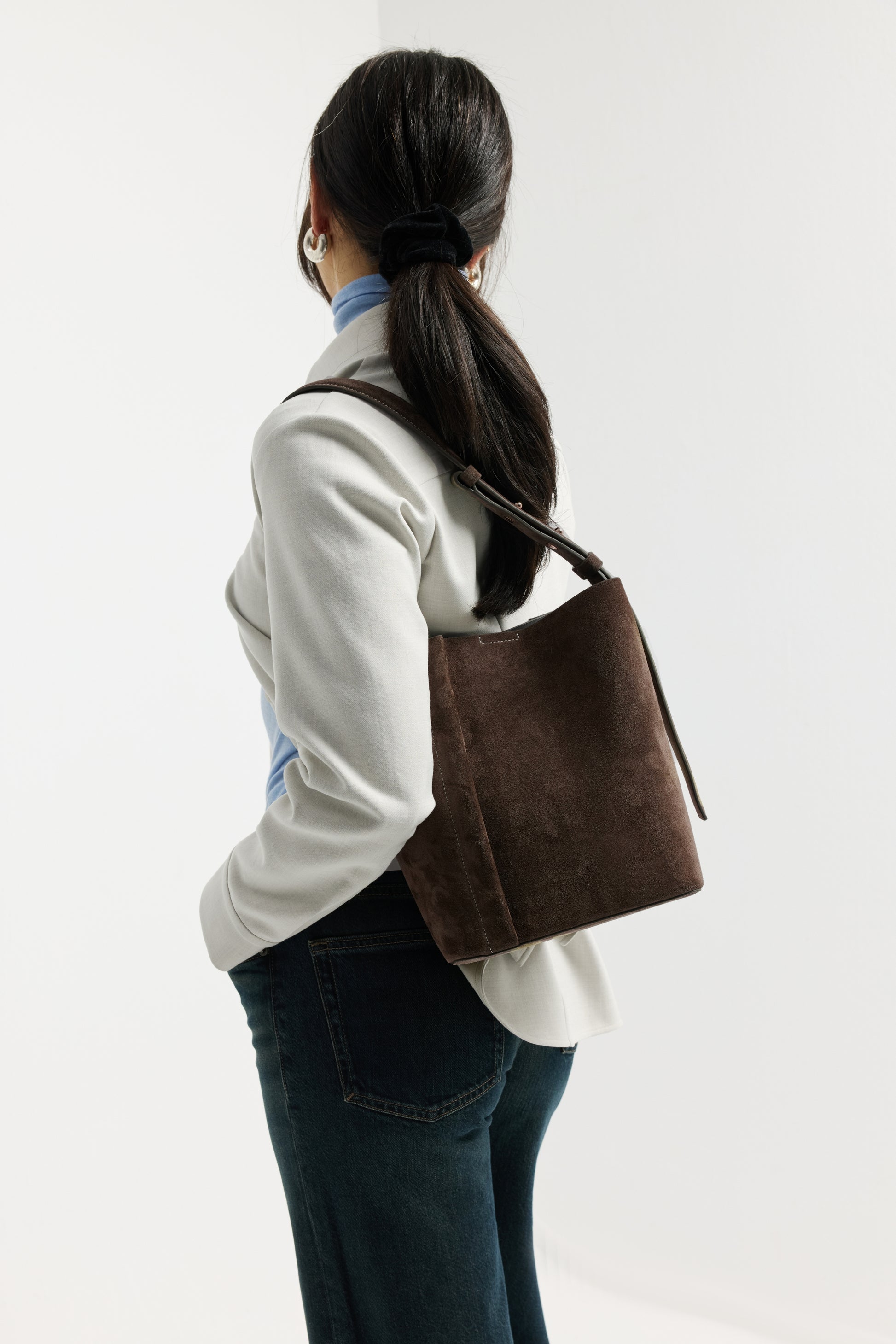 Yumuşak ve kadifemsi dokuya sahip süet deri üzerindeki belirgin kırık beyaz dikişlerle kontrast bir estetik sunan The Tote Plissé, geniş iç hacmi ve ayarlanabilir omuz askısıyla günlük eşyalarınızı rahatça taşımanızı sağlar. Deri astarı rafine bir dokunuş katarken, çıkarılabilir iç çantası küçük eşyalarınızı şehir içinde hareket halindeyken güvenle taşımanıza yardımcı olur.
