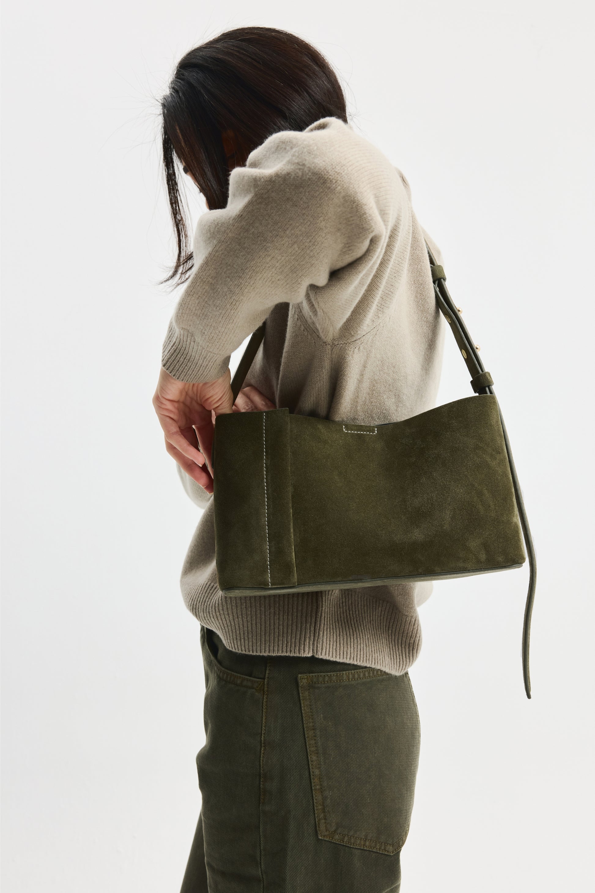 Yumuşak ve kadifemsi dokuya sahip haki süet deri üzerindeki belirgin kırık beyaz dikişlerle kontrast bir estetik sunan The Tote Plissé, zarif yatay tasarımı ve ayarlanabilir askısıyla omuzda ya da çapraz şekilde günlük eşyalarınızı rahatça taşımanızı sağlarken, deri astarı rafine bir dokunuş katar.