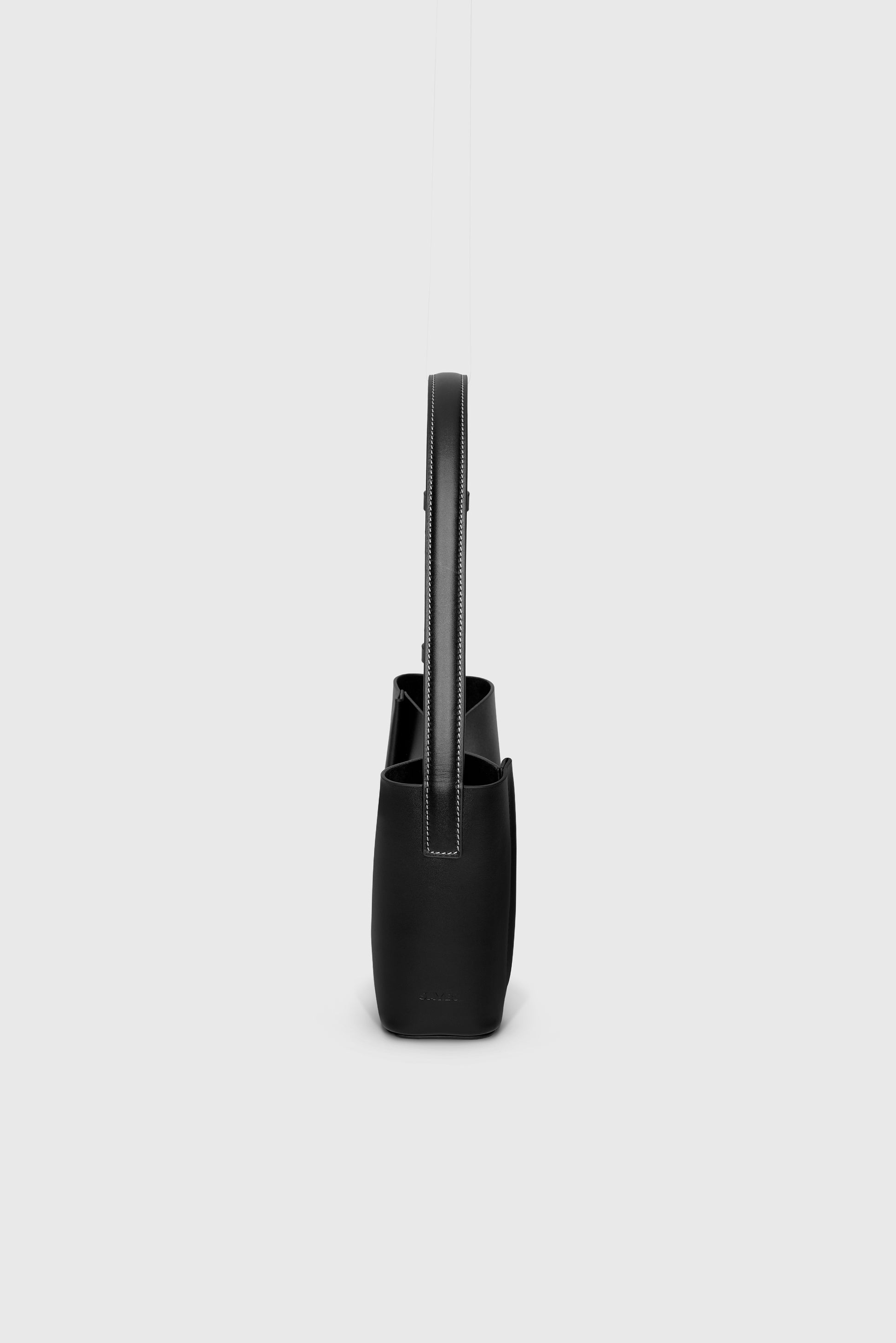 Hafif parlak bitişli siyah dana derisi üzerindeki belirgin kırık beyaz dikişlerle kontrast bir estetik sunan The Tote Plissé, zarif yatay tasarımı ve ayarlanabilir askısıyla